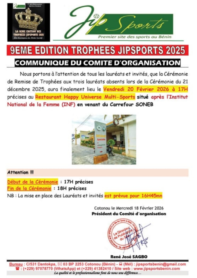 Absents en décembre dernier dans le cadre des cérémonies de remise de trophées JIPSPORTS aux Lauréats en raisons des occupations professionnelles; les trois acteurs sportifs sont conviés à une cérémonie spéciale ce vendredi à 17h pour la remise officielle des trophées a notifié le comité d’organisation dans un communiqué